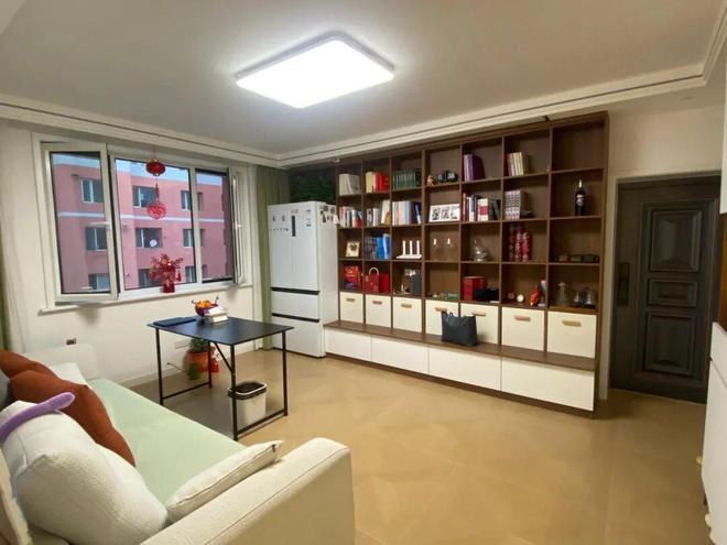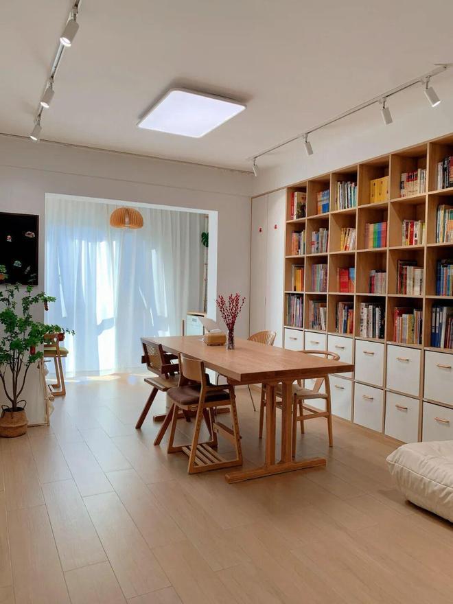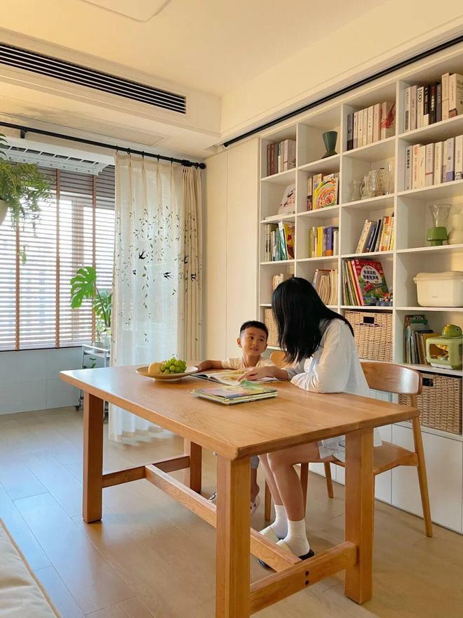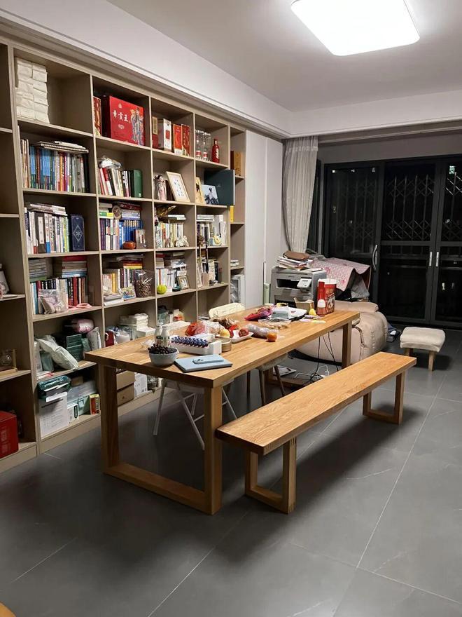 网友@天天热拿铁:我不仅设计满墙书柜,还给客厅放了一张大长桌。平时办公、辅导孩子、吃饭都在这里,感觉这种布局就是小户型的“救星”啊。