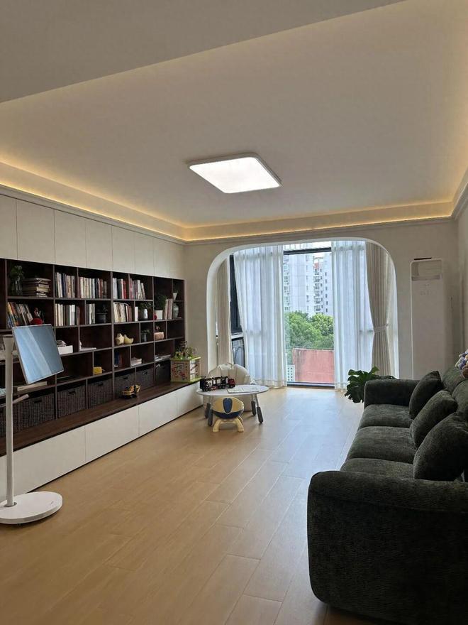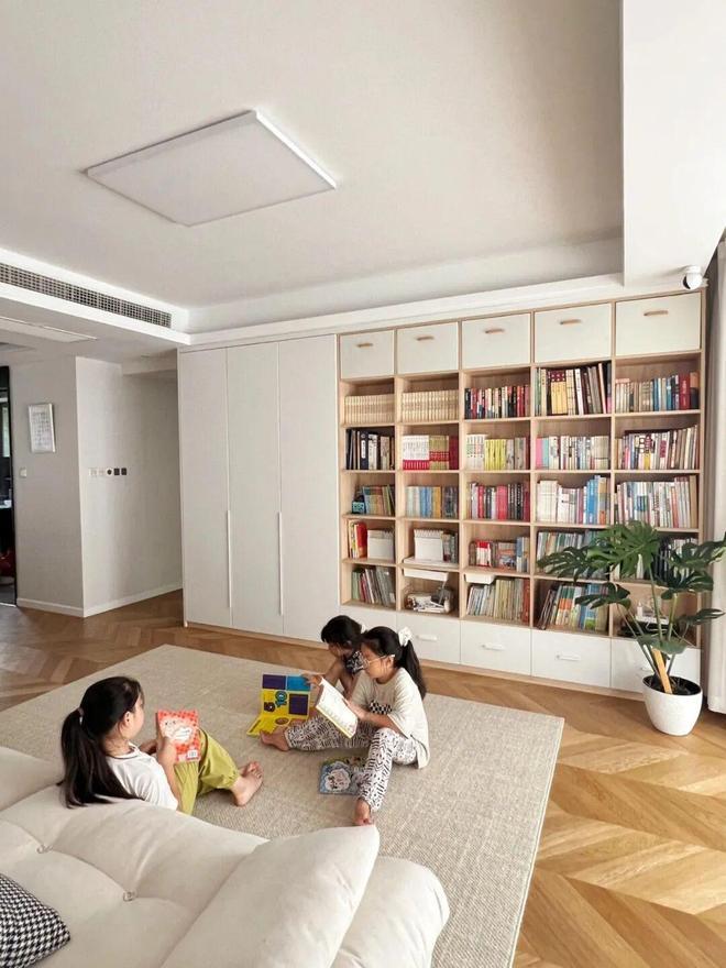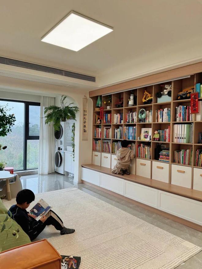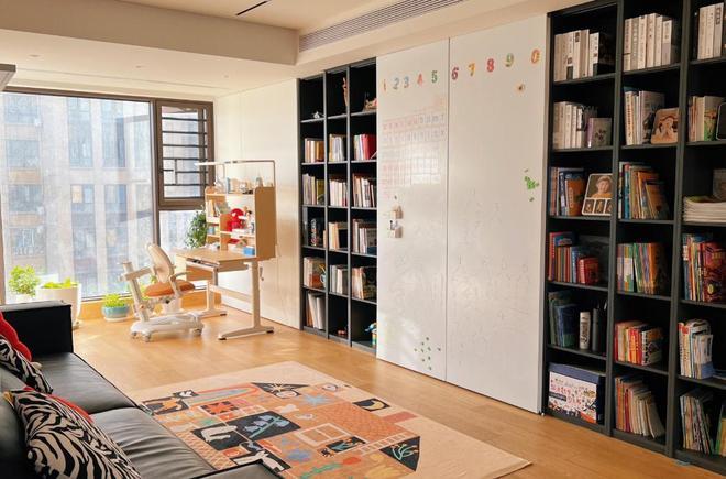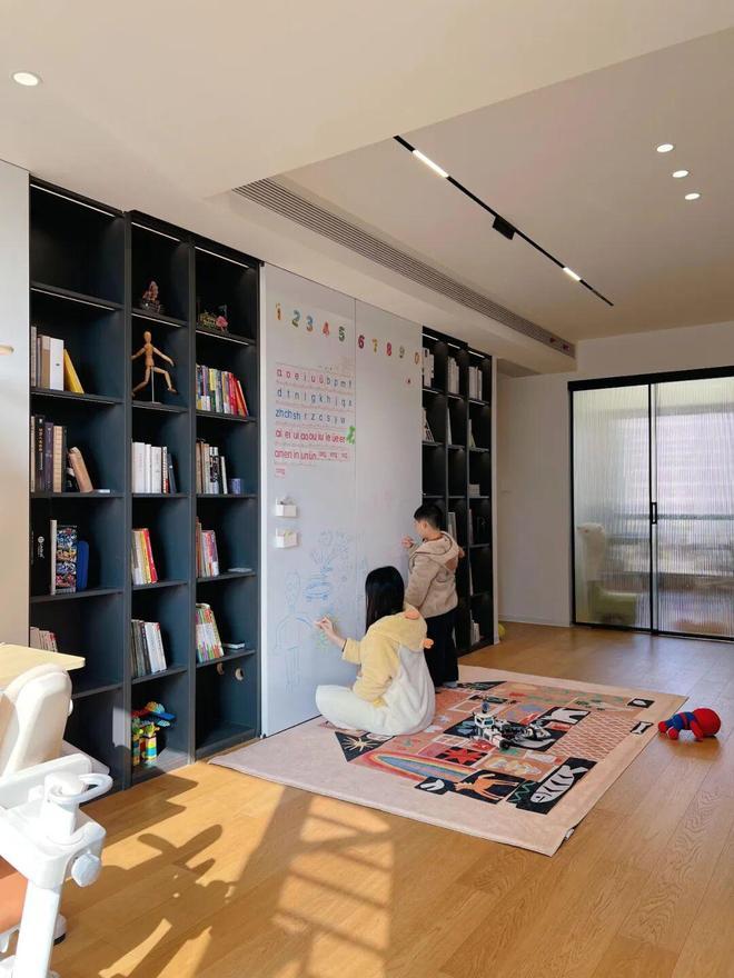 网友@小张姐姐:有娃之后,才知道客厅满墙书柜有多实用。收纳、活动、亲子、涂鸦,妥妥的客厅C位,利用率超高。