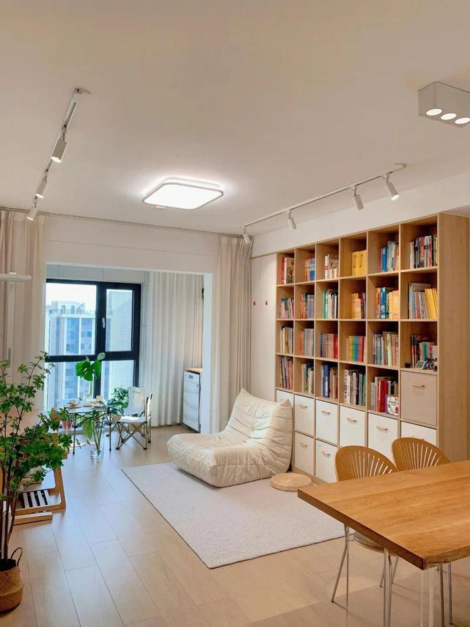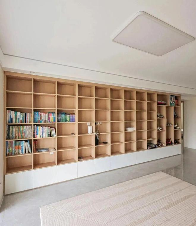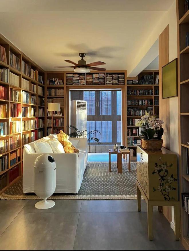 如果你不需要传统的客厅功能,那么满墙书柜反而可以赋予空间更多种生活模式。阅读、工作、亲子,最大化提升空间使用率。