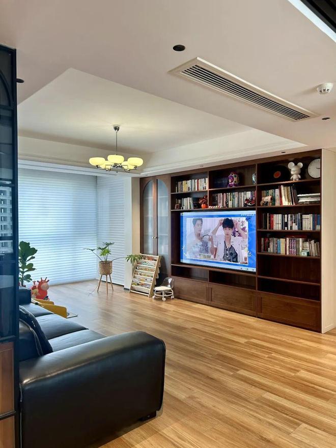 网友@南瓜:看了很多电视墙造型,最后还是决定设计一组满墙书柜。简单、耐看、有韵味,还能收纳。就连朋友来看了,都说很有文化气息。