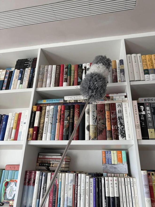 网友@多斯噜:满墙书柜好看是真的,吃灰也是真的,基本上每个星期都要清洁一次,不然书上都是灰,只能说好看是有代价的。