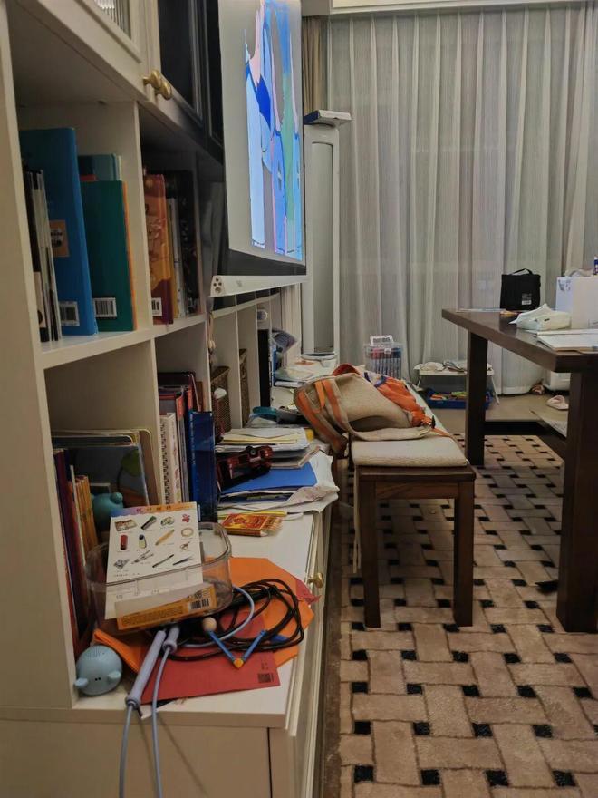 网友@青理:当初做去客厅化设计,是希望孩子能在大人的陪伴下学习;可才仅仅一年多,就已经沦为了杂物堆积区。
