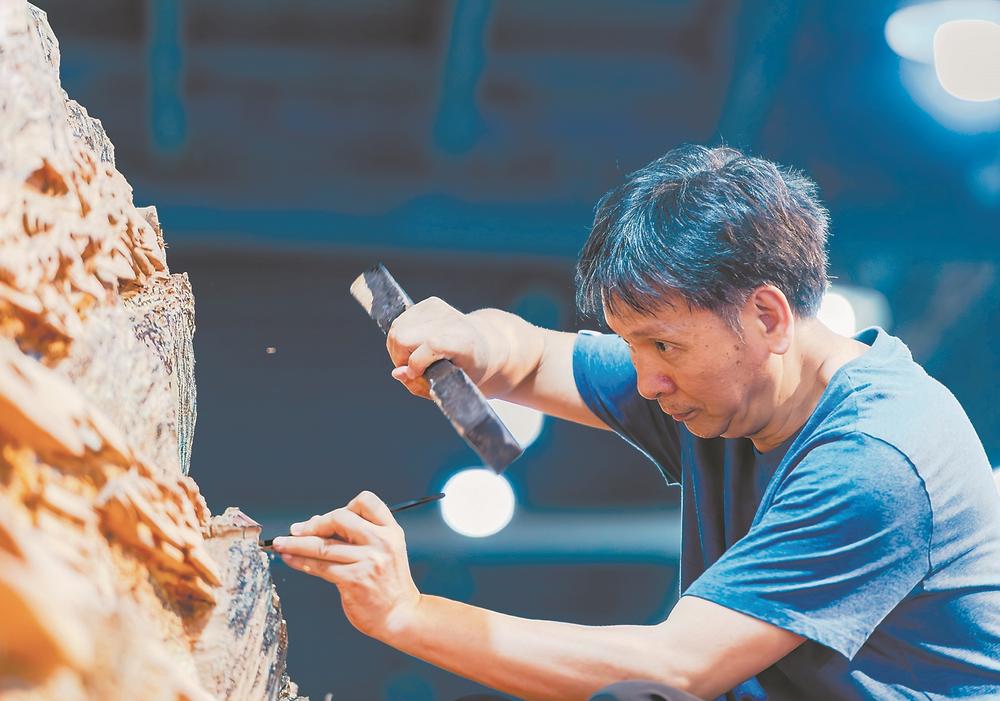 国家级非遗项目莆田木雕代表性传承人郑春辉在莆田美术馆进行雕刻创作。新华社