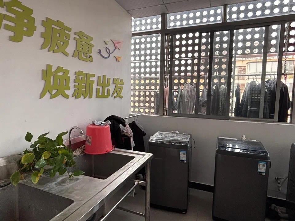 记者看到,小哥公寓内整体环境干净整洁。电梯里贴着“宿舍公约”,部分房间门口挂着“卫生标兵”的标牌。共享厨房和洗衣房内,物品摆放得井然有序。