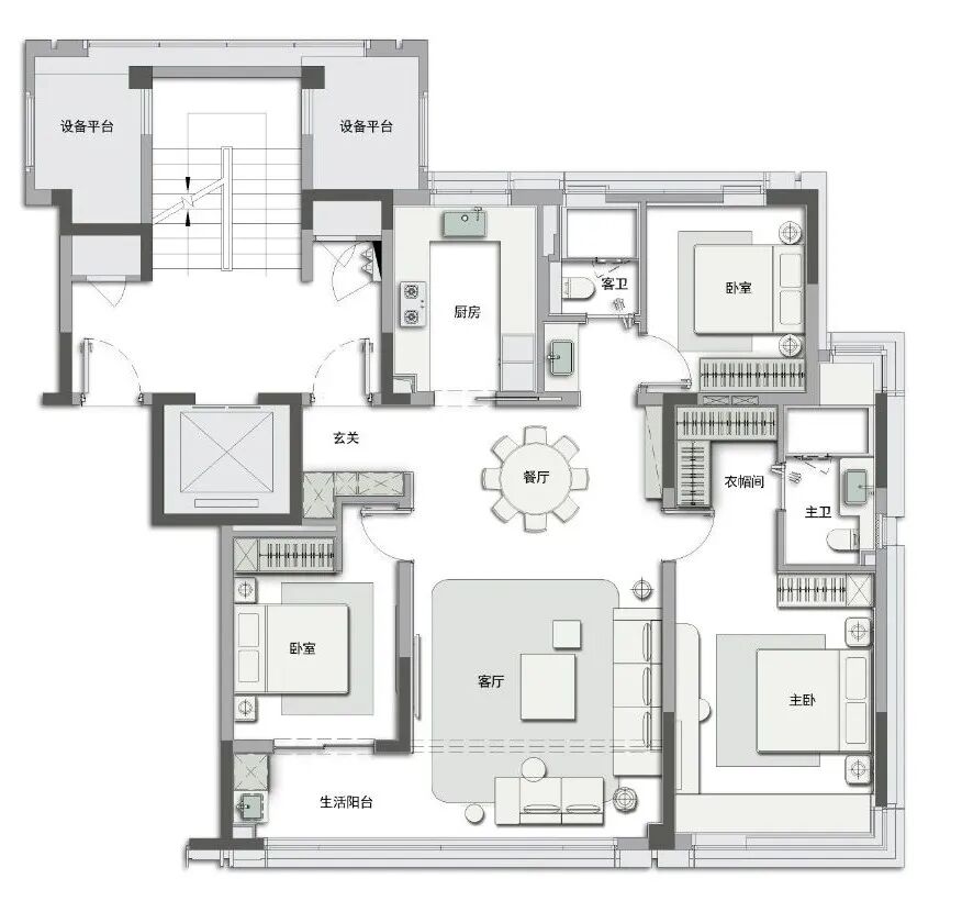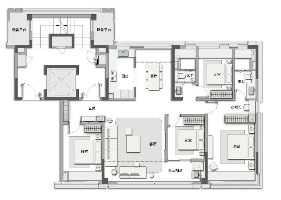 超大的房间尺度、主卧套房设计,独立卫浴、步入式衣帽间等等设计让生活的仪式感体现得淋漓尽致。主卧套房阔绰的双收纳区也让四季衣物有了充足空间。