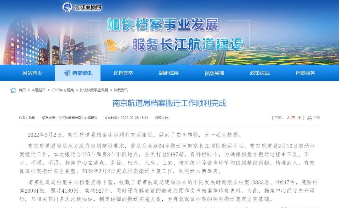 不过在2022年3月,长江航道局官网显示:南完美体育 365官网登录入口京航道局服从地方政府规划建设要求,需从公共路64号搬迁至南京长江国际航运中心,并已于2022年2月启动档案搬迁工作。