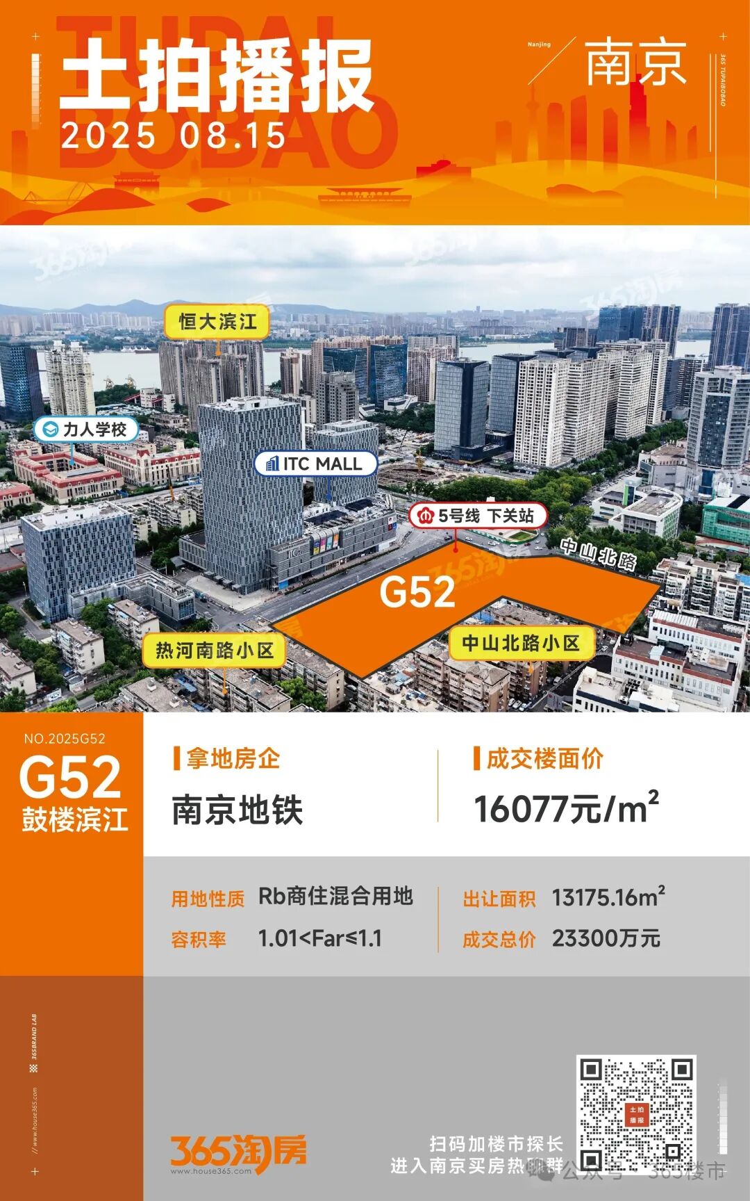 上个月,南京地铁以2.33亿总价拿下鼓楼滨江G52地块,该地块为双地铁上盖,容积率仅1.1,十分难得。