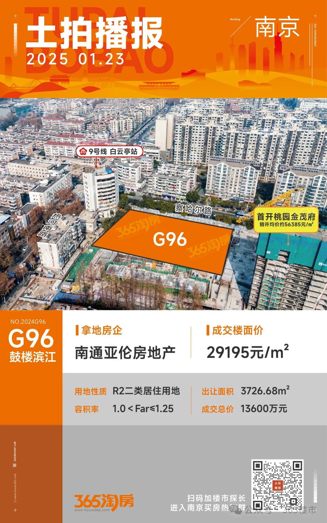 2025年1月23日,鼓楼滨江NO.2024G96地块经过19轮竞拍,最终以1.36亿元成交,成交楼面价29195元/㎡,拿地房企为南通亚伦,溢价率16.24%!