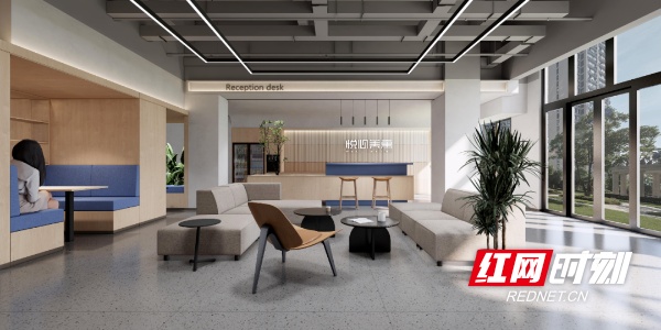 悦心美寓(悦居新苑站)还设置了公共活动区域,图为多功能接待台空间效果图。